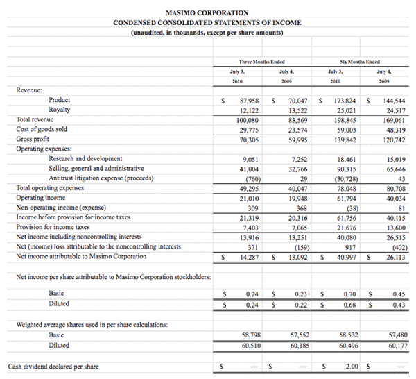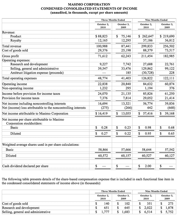 While dividends are not routine for the company, the company has previously paid special dividends to shareholders totaling $4.09 per share related to the 2006 intellectual property patent suit settlement agreement with a competitor and $2.00 per share in March 2010. While there can be no guarantees of future dividends, the Masimo Board remains committed to enhancing stockholder value based on its consideration of various factors, including the company's operating results, financial condition and anticipated capital requirements.
