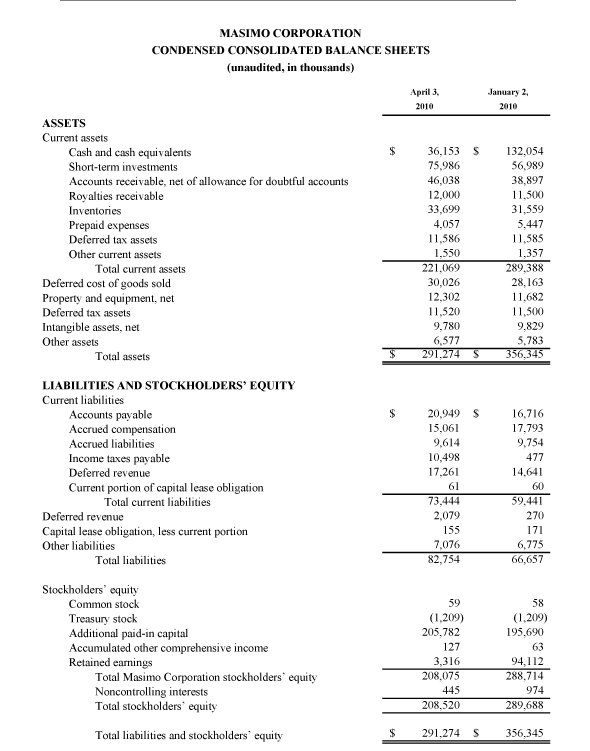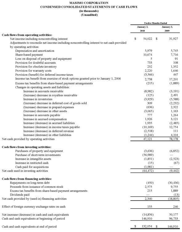Irvine, California, February 16, 2010 – Masimo (NASDAQ: MASI), the inventor of Pulse CO-Oximetry and Measure-Through Motion and Low Perfusion pulse oximetry, today announced its financial results for the fourth quarter and year ended January 2, 2010.
