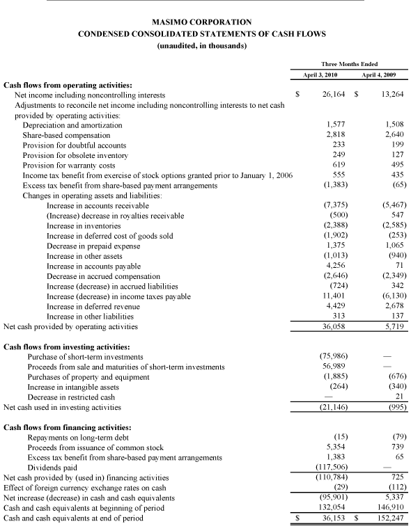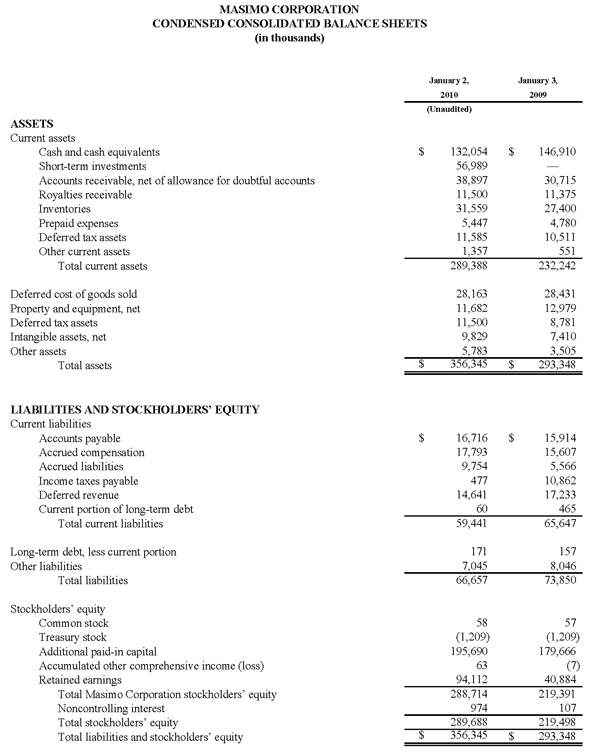 All statements other than statements of historical facts included in this press release that address activities, events or developments that we expect, believe or anticipate will or may occur in the future are forward-looking statements including, in particular, the statements about: our financial condition, results of operations, prospects and business generally; expectations regarding our ability to design and deliver innovative new noninvasive technologies; and expectations for total revenues, including royalty revenues, product revenues and Rainbow revenues, non-cash stock based compensation charges, and GAAP earnings per share for the full fiscal year 2010. These forward-looking statements are based on management's current expectations and beliefs and are subject to uncertainties and factors, all of which are difficult to predict and many of which are beyond our control and could cause actual results to differ materially and adversely from those described in the forward-looking statements. These risks include, but are not limited to, those related to: our dependence on Masimo SET and Masimo Rainbow SET products and technologies for substantially all of our revenue; any failure in protecting our intellectual property exposure to competitors' assertions of intellectual property claims; the highly competitive nature of the markets in which we sell our products and technologies; any failure to continue developing innovative products and technologies; the lack of acceptance of any new products and technologies of ours; obtaining regulatory approval of our current and future products and technologies, including the recently announced total hemoglobin measurement; the risk that the implementation of our international realignment, will not produce the anticipated operational and financial benefits, including a continued lower effective tax rate; the loss of our customers the failure to retain and recruit senior management; product liability claims exposure; a failure to obtain expected returns from the amount of intangible assets we have recorded; the maintenance of our brand; the impact of the decline in the worldwide credit markets on us and our customers; the amount and type of equity awards that we may grant to employees and service providers in the future; and other factors discussed in the "Risk Factors" section of our most recent periodic reports filed with the Securities and Exchange Commission ("SEC"), which you may obtain for free on the SEC's website at www.sec.gov. Although we believe that the expectations reflected in our forward-looking statements are reasonable, we do not know whether our expectations will prove correct. You are cautioned not to place undue reliance on these forward-looking statements, which speak only as of the date hereof, even if subsequently made available by us on our website or otherwise. We do not undertake any obligation to update, amend or clarify these forward-looking statements, whether as a result of new information, future events or otherwise, except as may be required under applicable securities laws.