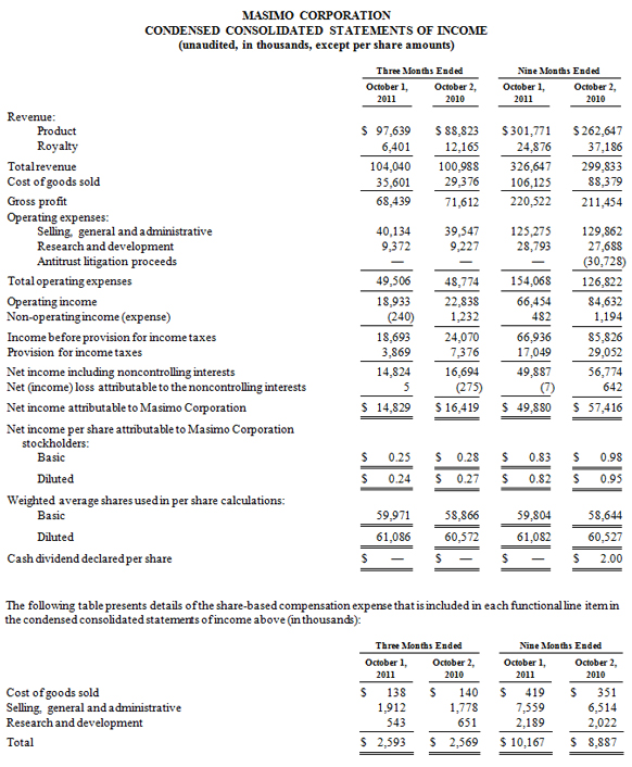 Masimo's net income for 2010 was $73.5 million, or $1.21 per diluted share, including $0.18 per diluted share from the net of a one-time gain related to the $30.8 million in antitrust proceeds from Covidien and offset by $14.7 million in marketing and other related expenses that Masimo had previously planned and announced after receiving the proceeds. Excluding these one-time items, adjusted net income for 2010 was $62.5 million, or $1.03 per diluted share, compared to net income of $53.2 million, or $0.88 per diluted share, in 2009.