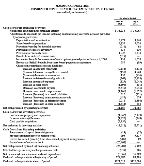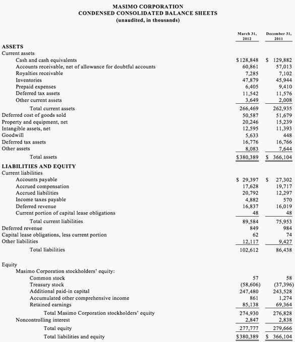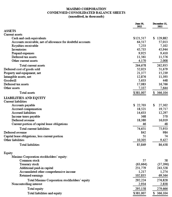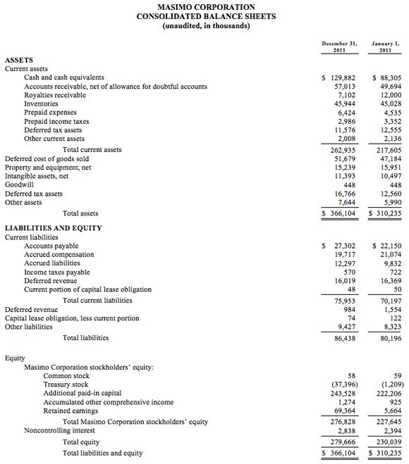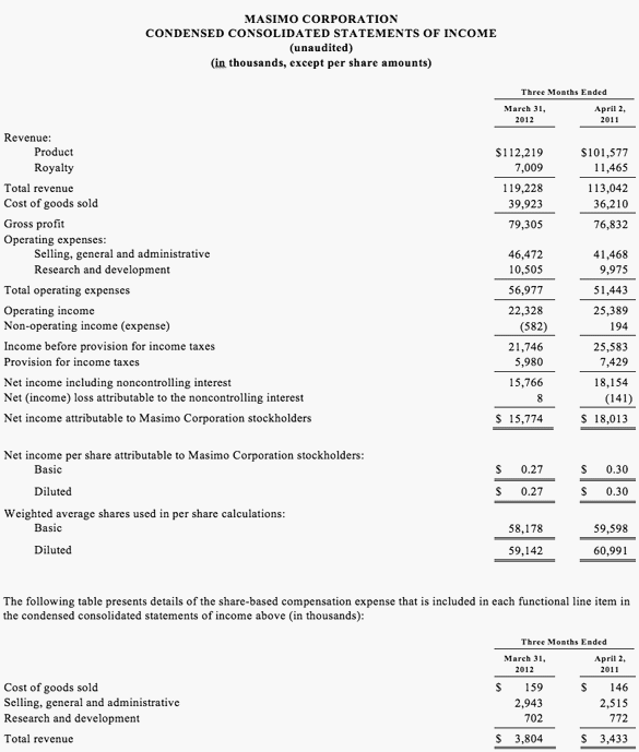 Masimo expects fiscal 2012 total revenue to be approximately $483 million, including product revenue of $455 million and royalty revenue of $28 million. Included within the 2012 product revenue guidance is a rainbow revenue expectation of $45 million. The company expects fiscal 2012 GAAP earnings per share to be $1.20. Each of the components of Masimo's guidance set forth above is an estimate only and actual performance could differ.
