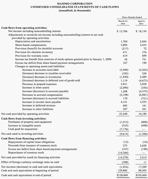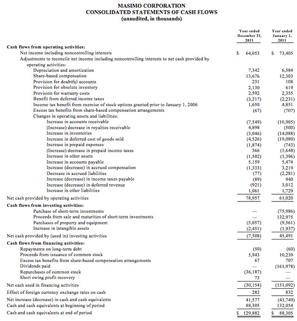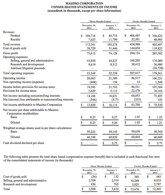 Net income for the fourth quarter was $13.8 million, or $0.23 per diluted share, compared to reported net income of $16.1 million, or $0.26 per diluted share, in the fourth quarter of 2010. Excluding one-time expenses in the year-ago period, Masimo's adjusted net income and adjusted earnings per share for the fourth quarter of 2010 were $17.5 million and $0.29, respectively.