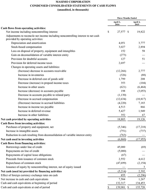 This press release includes forward-looking statements as defined in Section 27A of the Securities Act of 1933 and Section 21E of the Securities Exchange Act of 1934, in connection with the Private Securities Litigation Reform Act of 1995. These forward-looking statements are based on current expectations about future events affecting us and are subject to risks and uncertainties, all of which are difficult to predict and many of which are beyond our control and could cause our actual results to differ materially and adversely from those expressed in our forward-looking statements as a result of various risk factors, including, but not limited to: risks related to our belief that Masimo's unique noninvasive measurement technologies contribute to positive clinical outcomes and patient safety; risks related to our belief that Masimo noninvasive medical breakthroughs provide cost-effective solutions with comparable accuracy and unique advantages; as well as other factors discussed in the "Risk Factors" section of our most recent reports filed with the Securities and Exchange Commission ("SEC"), which may be obtained for free at the SEC's website at www.sec.gov. Although we believe that the expectations reflected in our forward-looking statements are reasonable, we do not know whether our expectations will prove correct. All forward-looking statements included in this press release are expressly qualified in their entirety by the foregoing cautionary statements. You are cautioned not to place undue reliance on these forward-looking statements, which speak only as of today's date. We do not undertake any obligation to update, amend or clarify these statements or the "Risk Factors" contained in our most recent reports filed with the SEC, whether as a result of new information, future events or otherwise, except as may be required under the applicable securities laws.