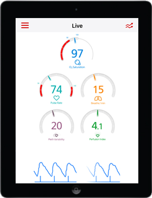 With the Bluetooth® LE-equipped model, you can see and share parameter data, including trends and the pleth waveform, via the Masimo SafetyNet® App† on a compatible smart device.